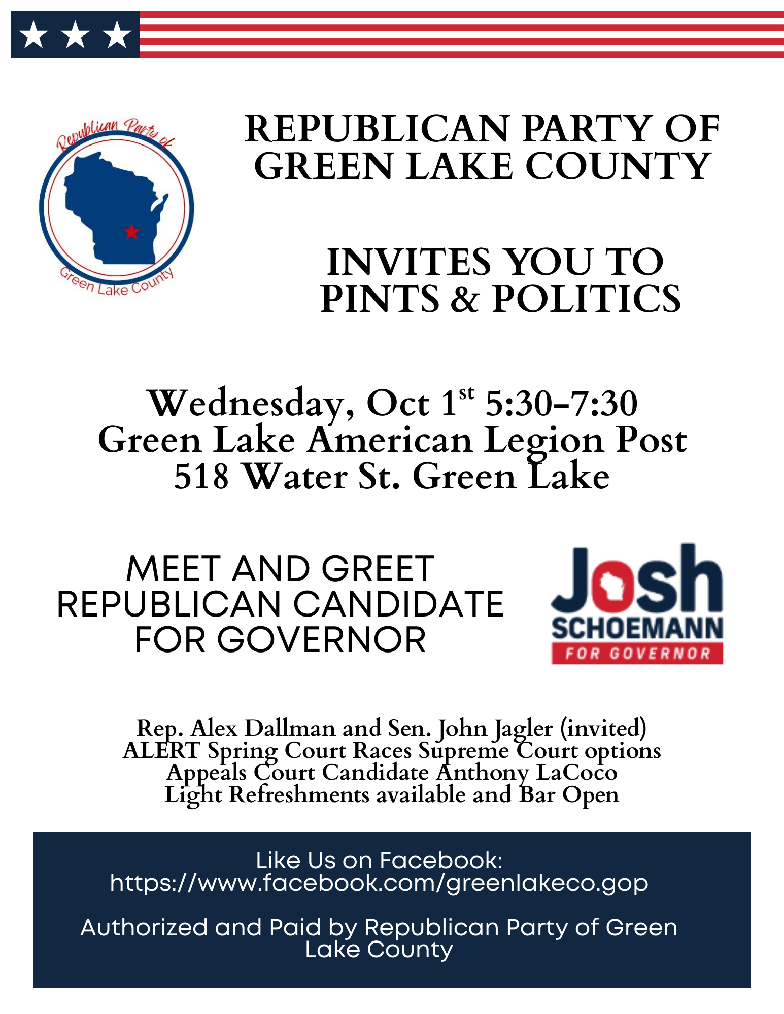 530 Hwy 23, Green Lake, WI 530 hwy 23, Green LakeCall to County Caucus Date: Wednesday, January 15th Location: Christiano’s, 530 WI-23, Green Lake WI 54941 Time: 6 PM Transact Business for the following: - Reports for 2024 - Treasurer’s Report - State RPW Constitution amendments / vote of each - Elected Official(s) updates / Other guests / Allowance of time for Q …